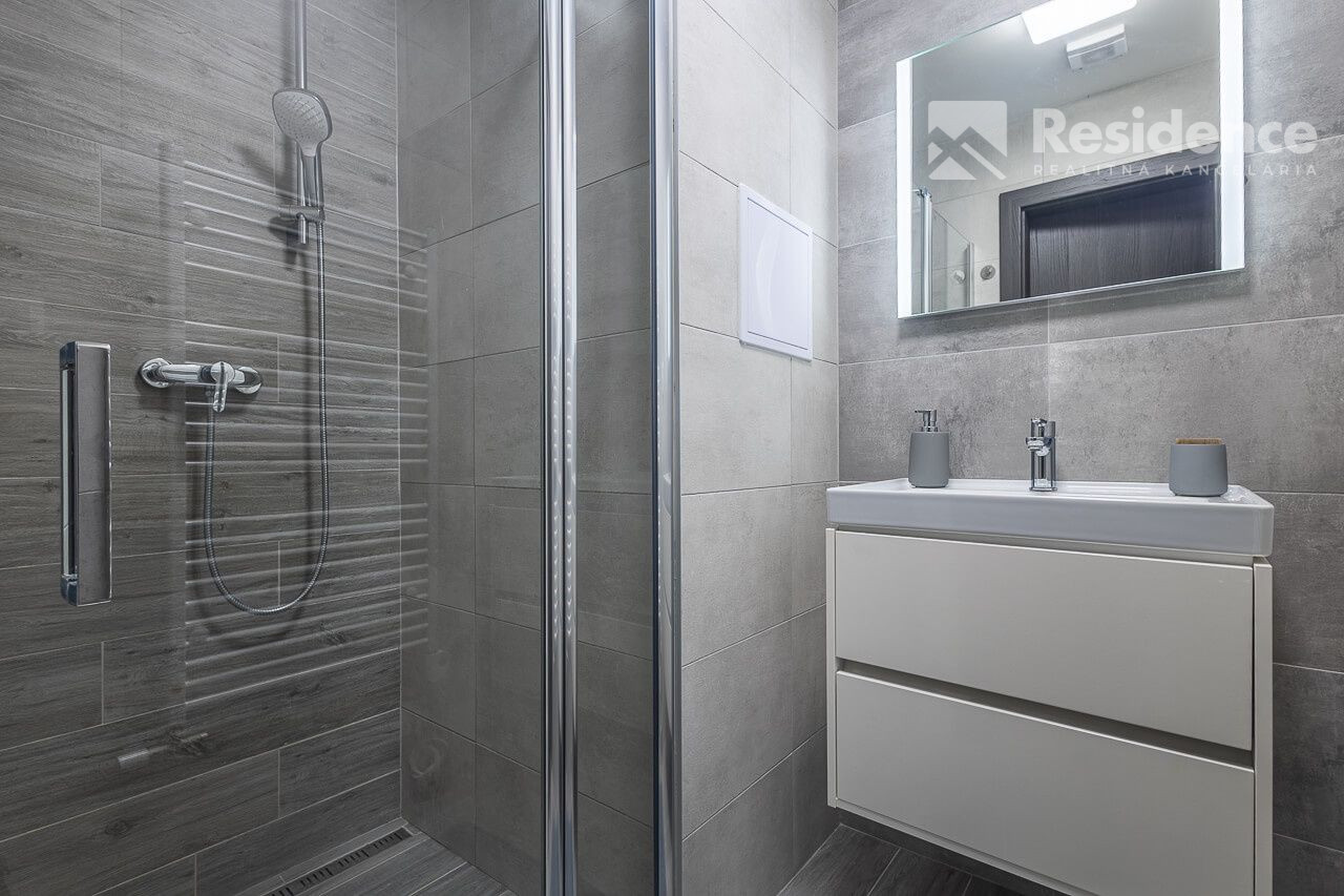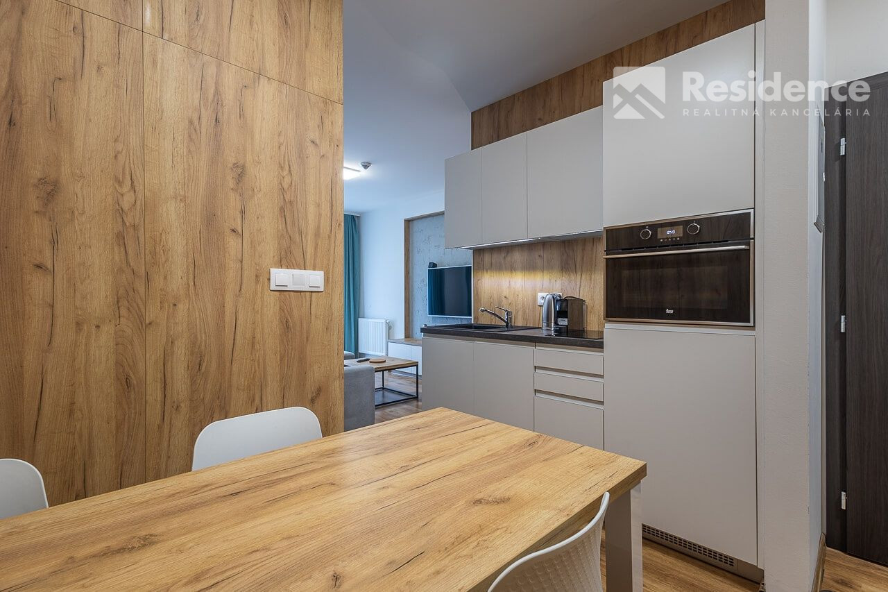 • Dispozícia: vstupná chodba poskytuje zázemie apartmánu s množstvom odkladacích priestorov. Moderná kúpeľňa je vybavená sprchovým kútom . Toaleta je samostatná. Obývacia izba je prepojená s kompletne vybaveným kuchynským kútom a jedálenskou časťou. Hlavná spáleň poskytuje dostatok priestoru a je z nej výstup na peknú západne orientovanú lodžiu