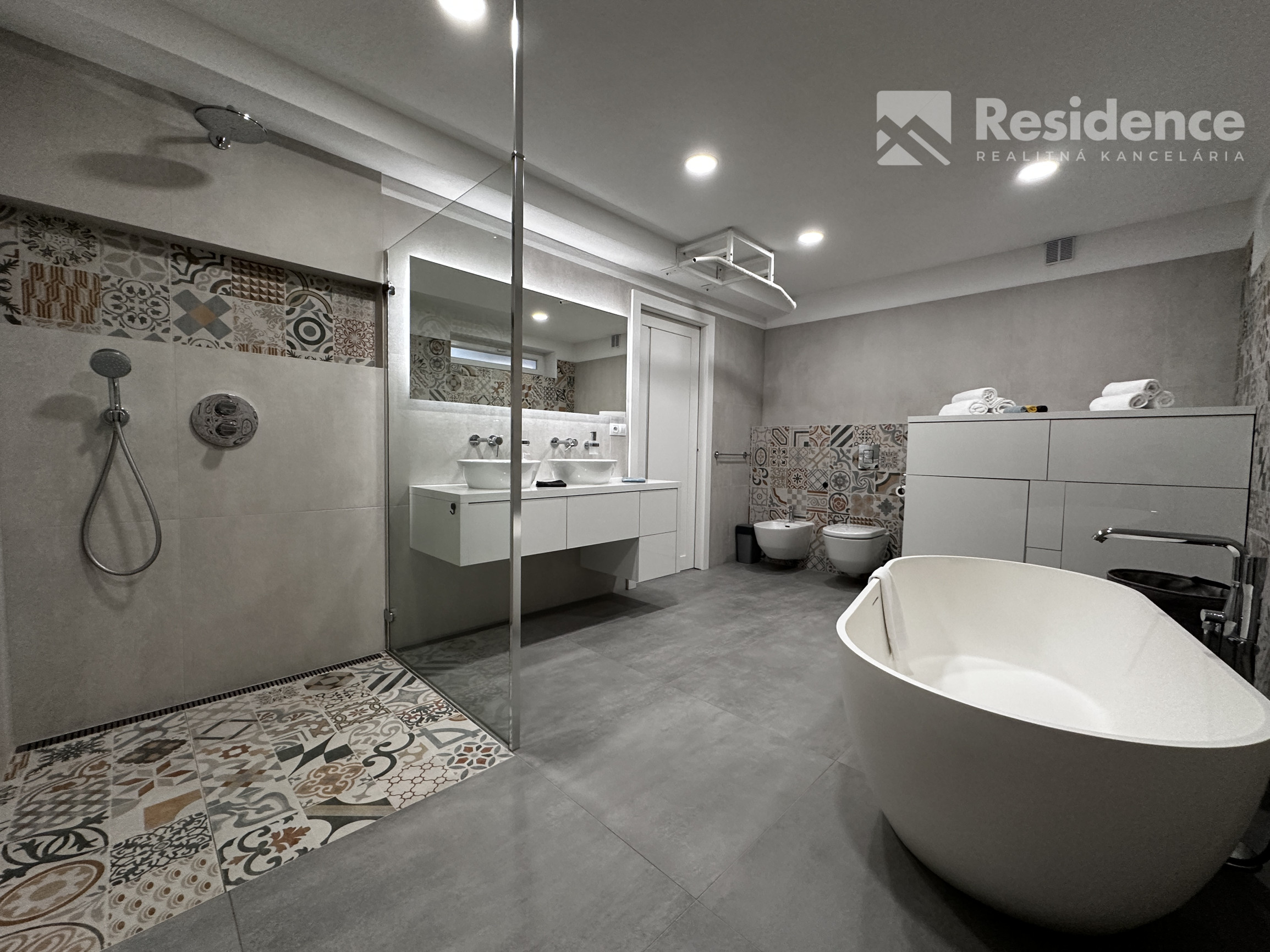 Moderná kúpeľňa so sprchovým kútom, vaňou a WC
