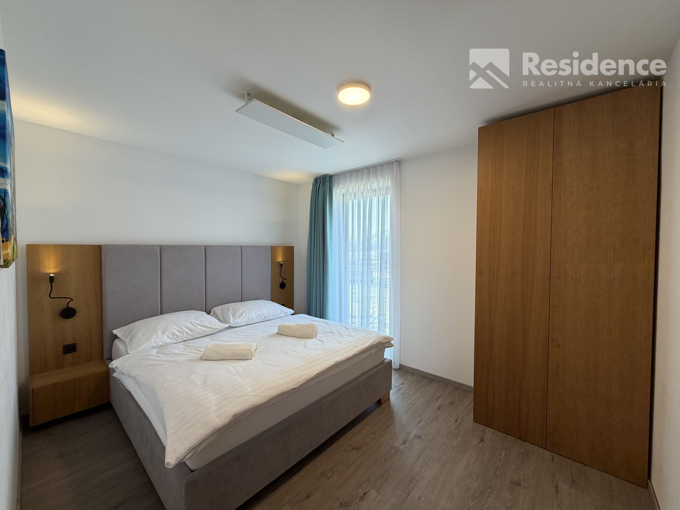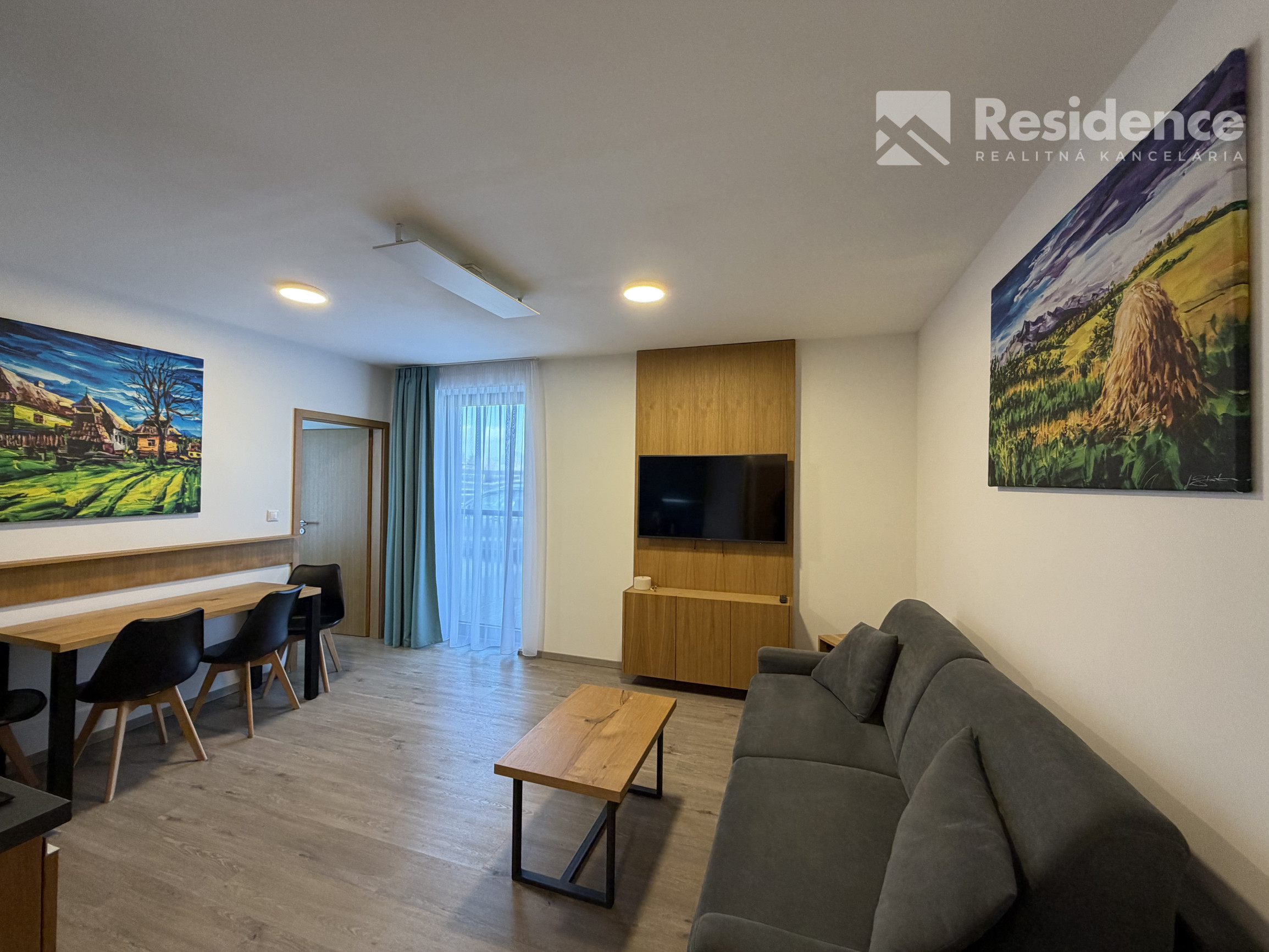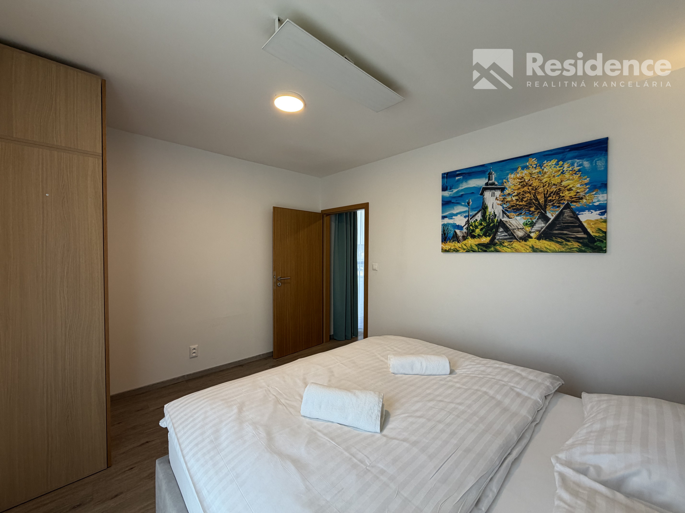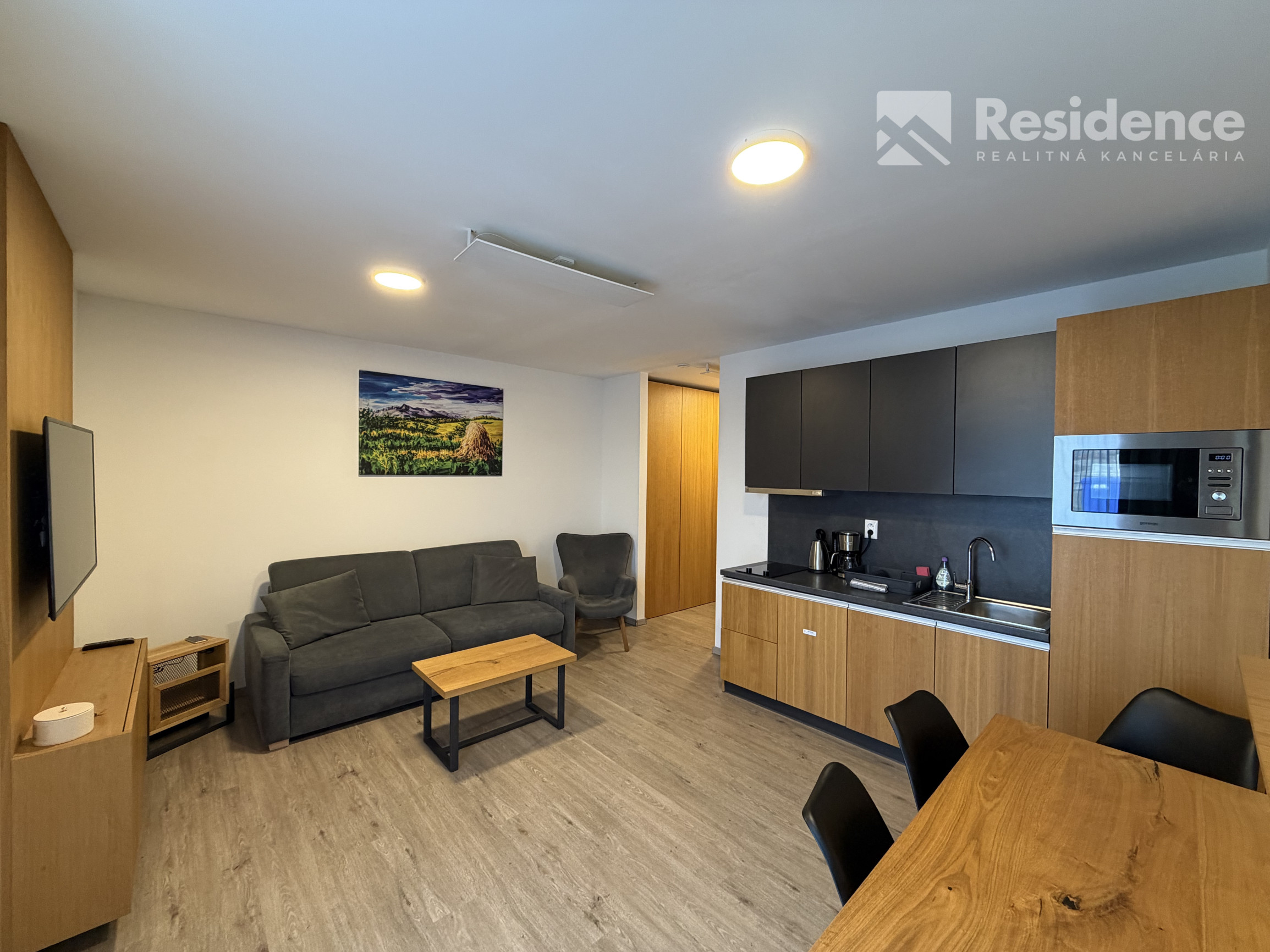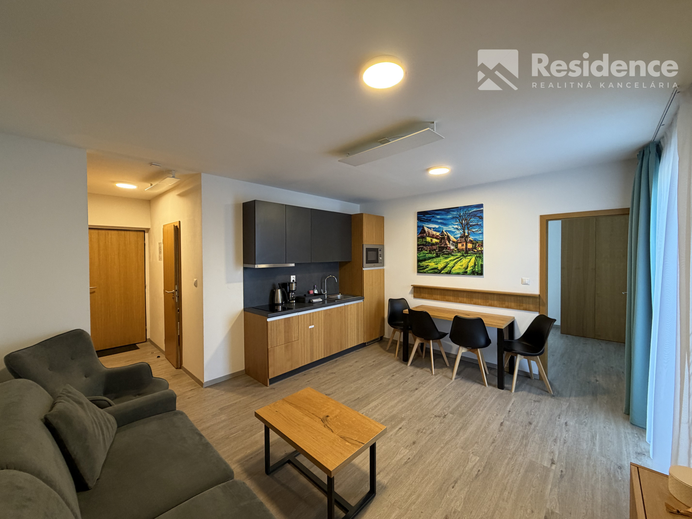Dispozícia: 1-izbový apartmán (obývačka s kuchynským kútom + samostatná spálňa)